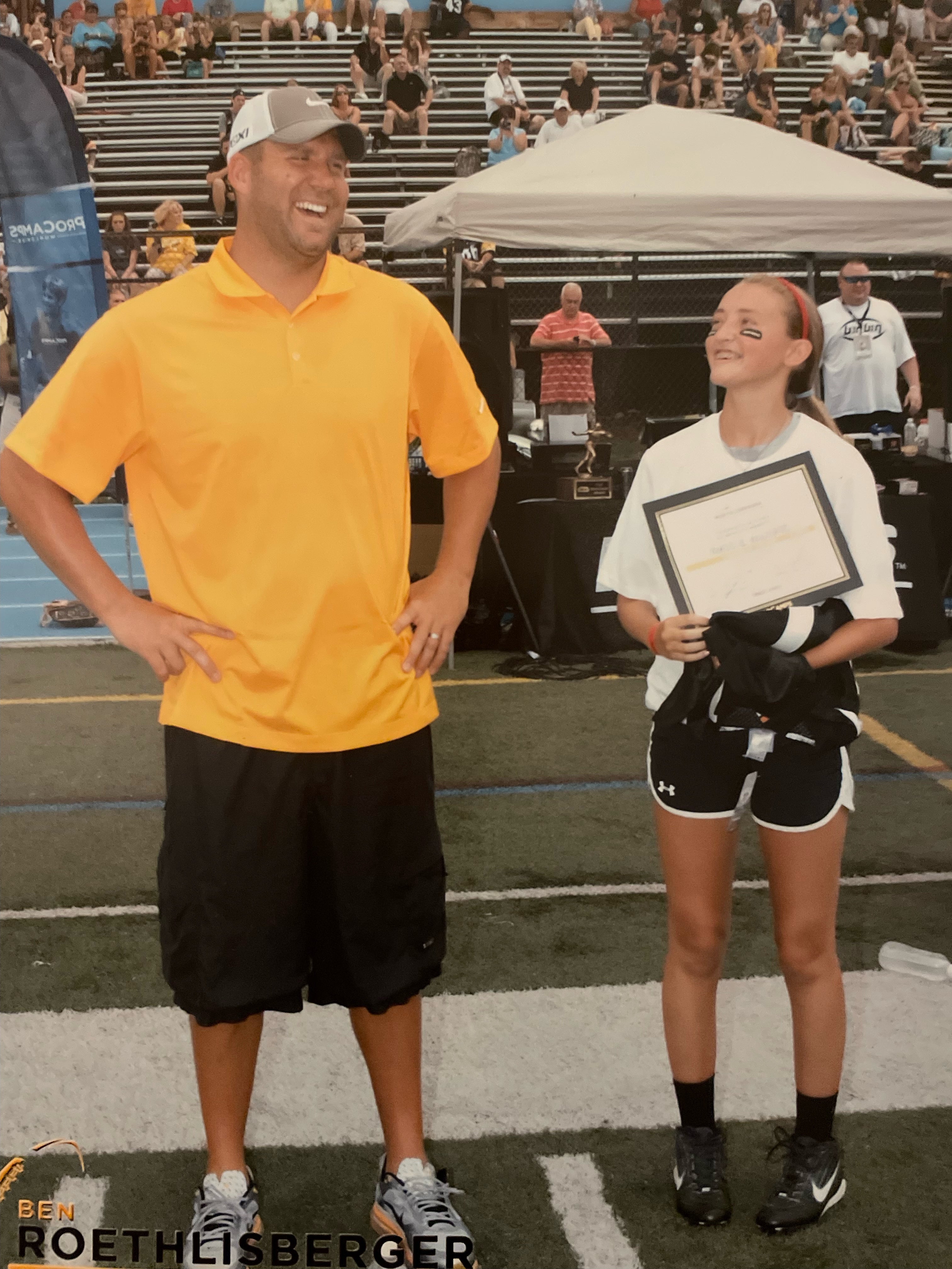 I was 10 years old when the Steelers drafted you. I remember being at a baseball tournament while the draft was going on back in 2004. My dad was so excited. "I think we're about to get that Roethlisberger kid" he eagerly said to me. My sister, ironically enough, was 7 years old. And I want to take a bit to talk about her. She fell in love with you from the day you became a Steeler. So did the rest of us, but she was different. She came to your summer football camp, as one of the only girls, when she was 11. She came back the next year when she was 12. She actually won camper of the day. Got to meet you. Spend time with you. This is her way back when with you.