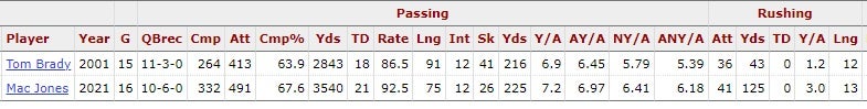 … Brady's rookie season was a wash. He had three pass attempts in all. But to make the obvious comp, with Brady having the full advantage of a season to sit behind Bledsoe and learn, the numbers are eerily similar:
