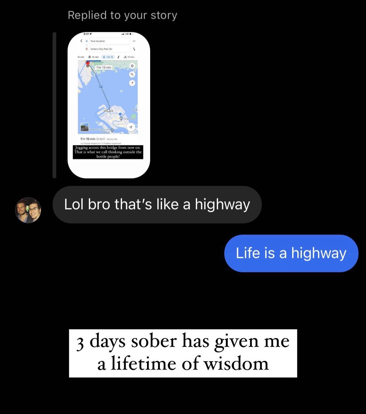 "Outside of being buzzed at a wedding this past October, I have been completely sober since the end of July 2020 and it's really not that hard. All you have to do is get pregnant and have a baby. You're still up all night & taking care of a buddy who fluctuates randomly between being a hoot to being a total mess depending on their last bottle. Not much different than the bars. You got this!"