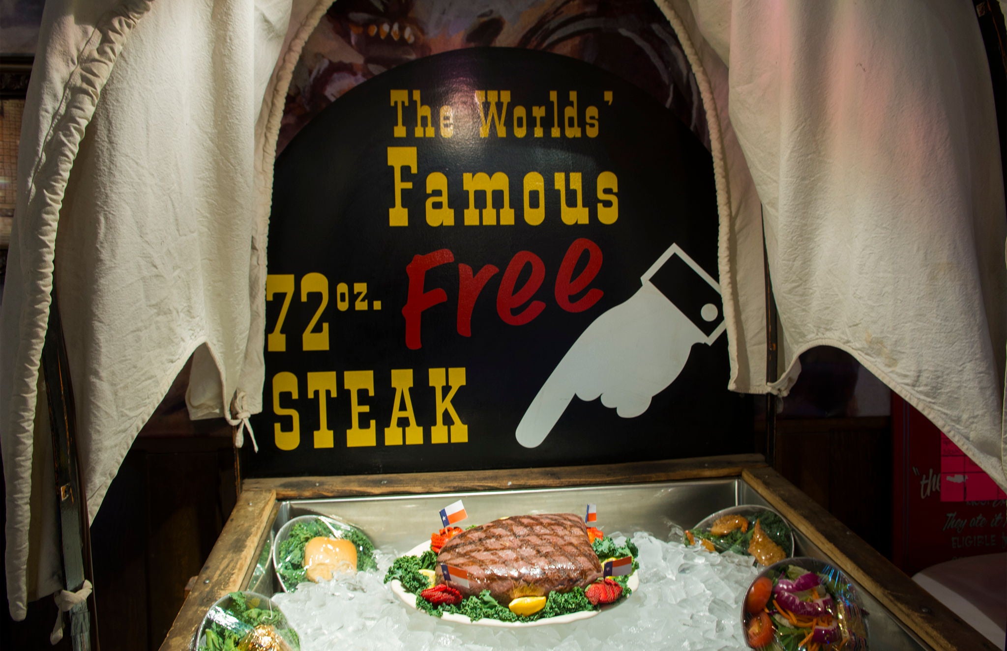 The Big Texan is best known for its 72 ounce (4.5 pounds or 2.04 kg) steak. The steak is free to anyone who, in one hour or less, can eat the entire meal, consisting of the steak itself, a bread roll with butter, a baked potato, shrimp cocktail, and a salad; otherwise, the meal costs $72.[3] Those who have successfully consumed the 72oz steak challenge have their names recorded and posted at the restaurant. To date, over 9,800 people out of about 68,000 people who attempted this challenge have accomplished this feat.