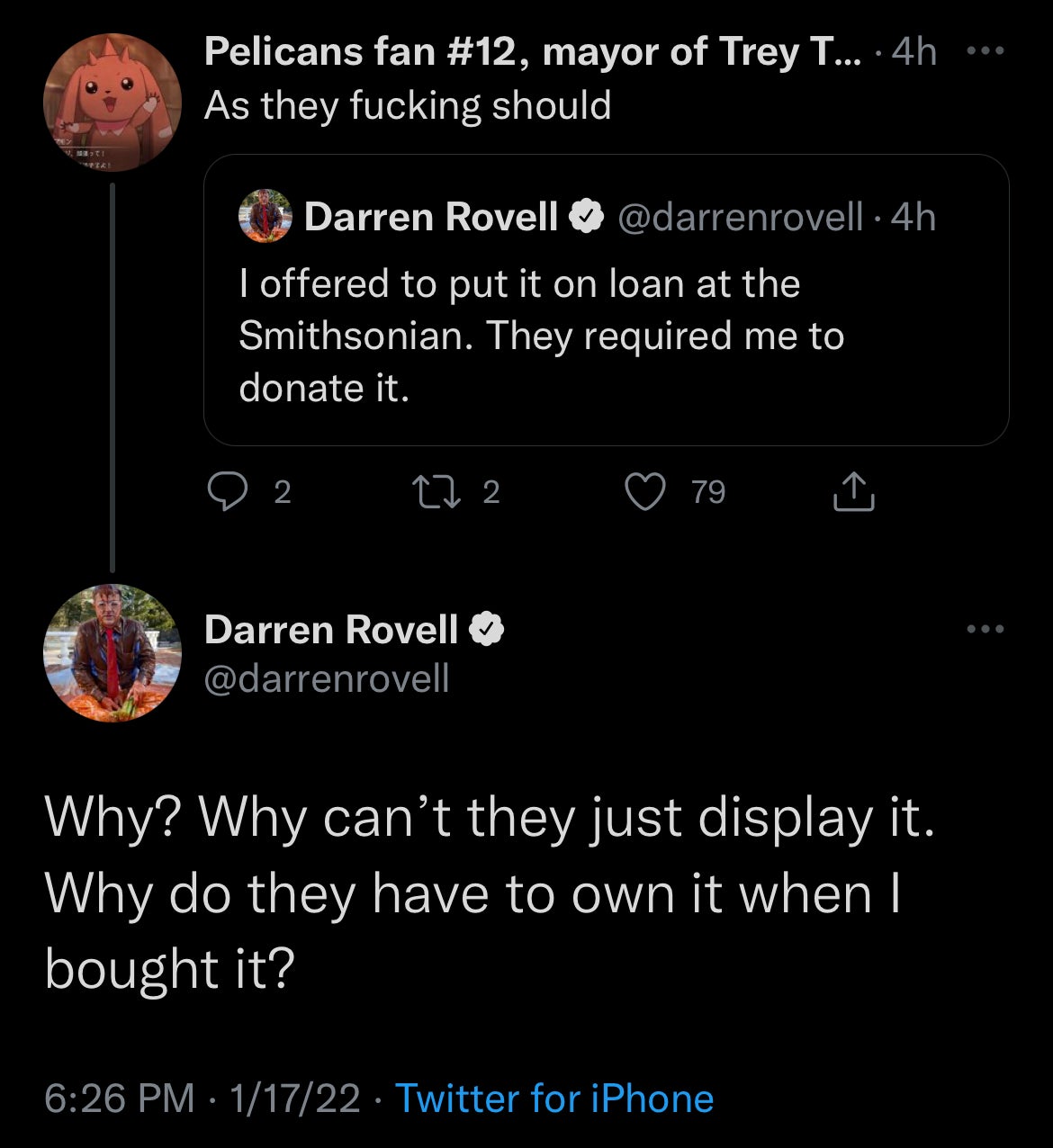 Every single thing I have learned about Darren Rovell has been against my will, and that doesn’t appear to be changing any time soon. He will never log off, he will never do the thing a real live human would do in any scenario he finds himself in, he will burn every historic artifact he owns upon his demise and wipe out an era of human history not unlike the flames at the Great Library of Alexandria. And there is simply nothing we can do to stop it.