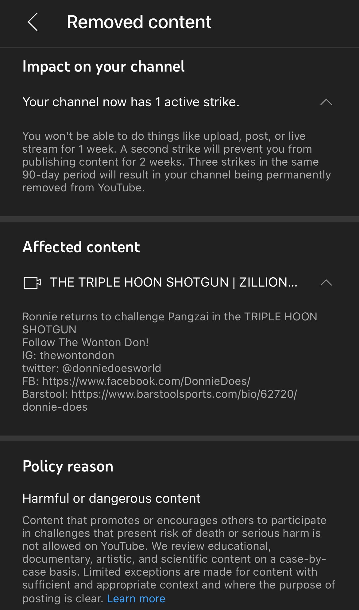I've been pumping out youtube videos for a looong time and had never received a strike, until now. Yesterday, I was notified that my youtube channel received a strike for "Harmful or Dangerous Content", and that consequently, I'd be unable to upload, post, or live stream for 1 week. Now which of my videos did Youtube perceive to contain "Harmful or Dangerous Content" you ask? Was it the video where I swim with hippos?