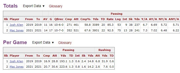 Diabolically ingenious thinking. All I can do is lay down my sword and shield and bend the knee to anyone capable of coming up with this. But before I go, I'll just address the idea that in today's NFL, it's all about the quarterback and nothing else. And leave this here. Mac Jones first season compared to Josh Allen's second season, via Pro Football Reference.