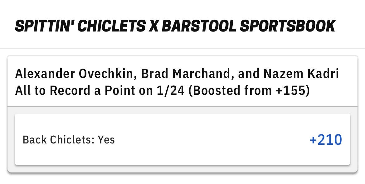 Get over Barstool Sportsbook, go under the Exclusives page, and hit this boost with the Chiclets Crew as we are all trying to add to our bankrolls for the Vegas trip next week for the Chiclets Cup!!!