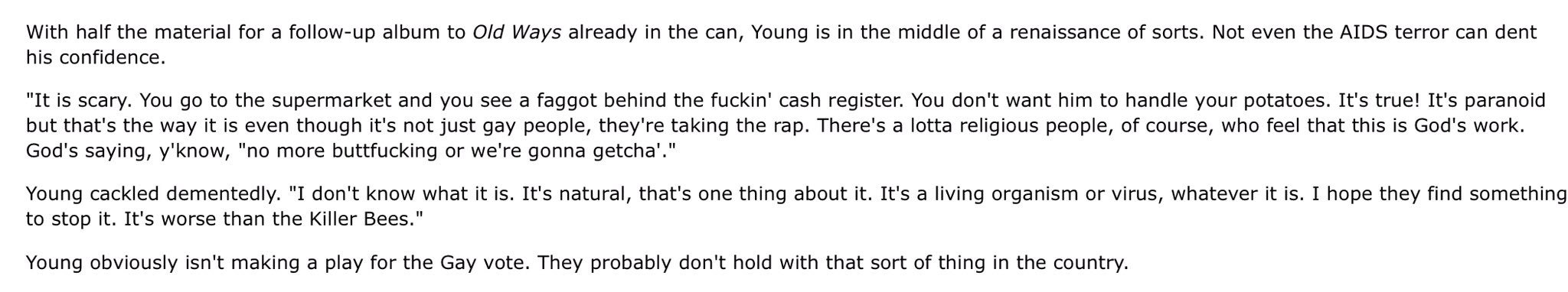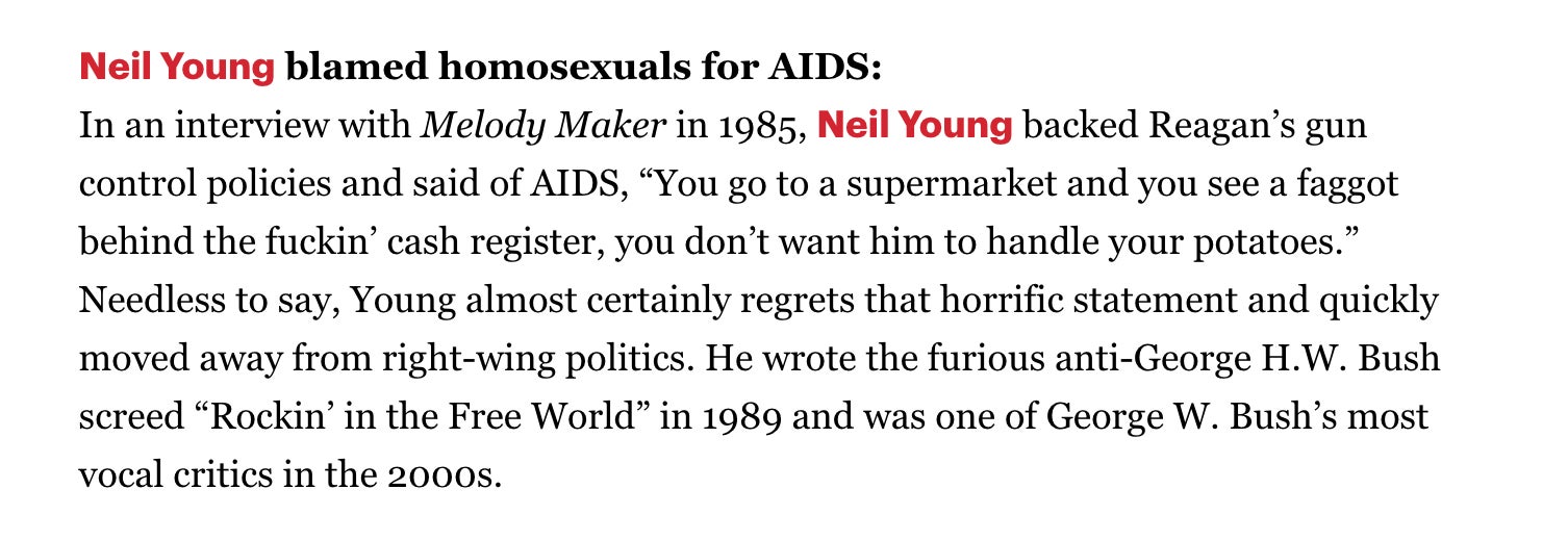 Neil Young, the same guy who in 1985 told the world that homosexuals were responsible for Aids and should be avoided in public-