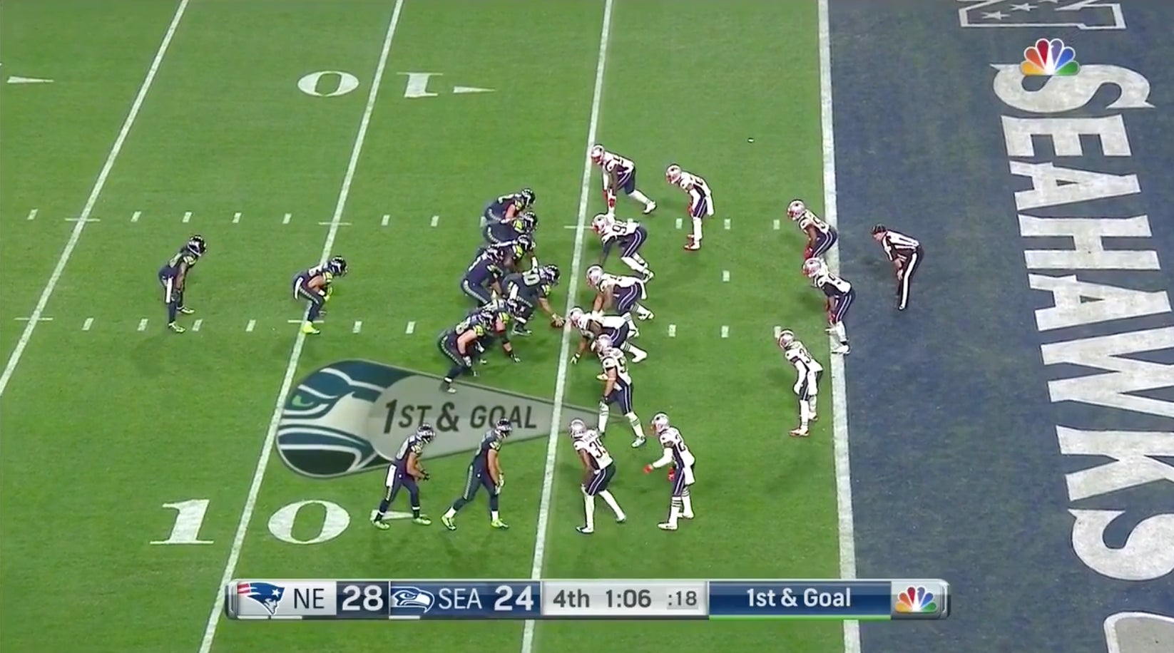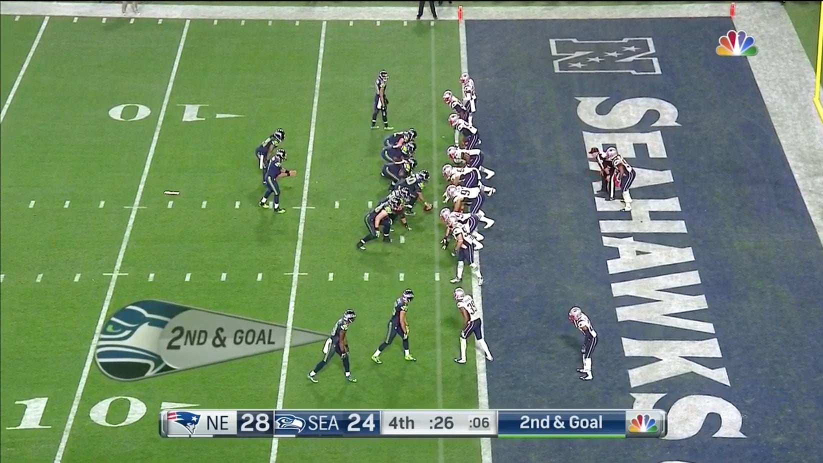 This is where Seattle and Pete Carroll fell apart. The Seahawks subbed their 21 personnel package out for a speedier 11 personnel package which means 1 Runningback, 1 Tight End, and 3 Receivers, while the Patriots left their heavier personnel package in the game to stop the run. Things don't look at favorable this time around for Seattle to pound it in without the Fullback in the game.