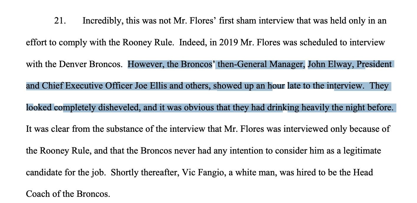 And I have to assume this is going to be a huge issue in the suit should it ever go to trial. Flores isn't just suing because he says Elway was unkempt and uninterested in talking to him. For 3 1/2 hours. He's trying to demonstrate a pattern of behavior from all the teams he's talked to over the years, and claiming it applies to the entire NFL, solely because of his race. If it turns out Elway's version of events is the truth, and these Broncos execs rearranged their lives and had a restless night just to chat with him for 3+ hours like it was Joe Rogan and Jordan Peterson, that is not going to help Flores prove a pervasive attitude and a pattern of behavior. So this is going to be very interesting if we ever get to hear more.