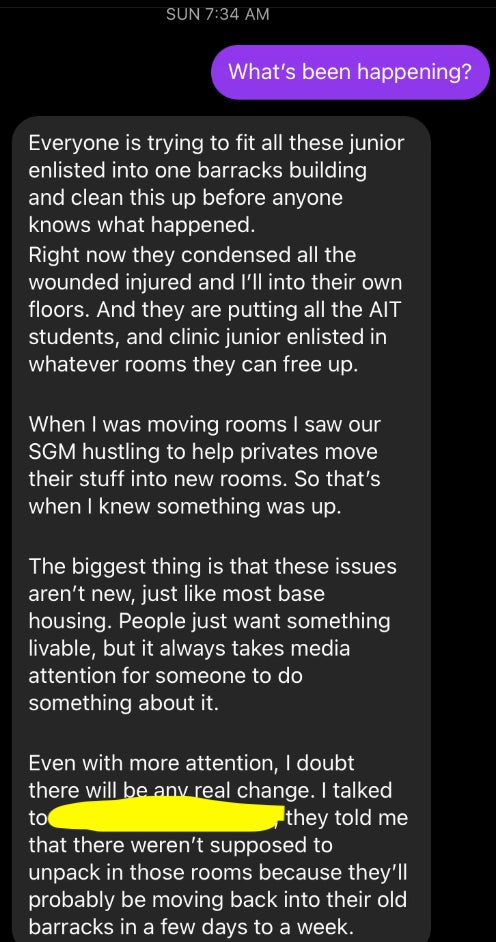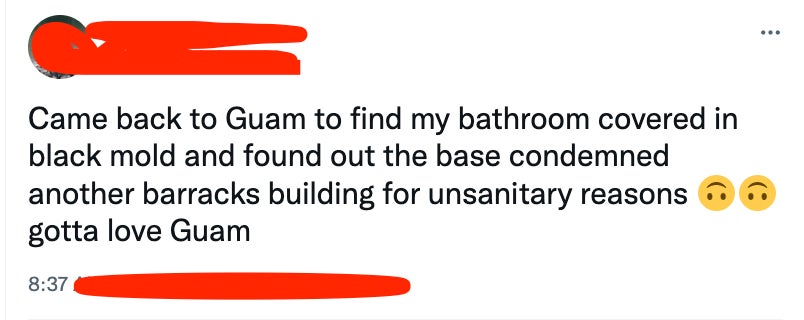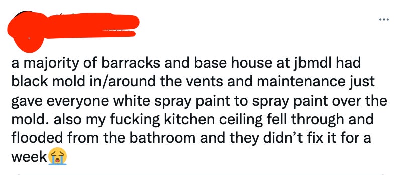 Poisonous jet fuel in the water, higher rates of cancer, children sickened by lead, barracks with asbestos, mold, and rodent & insect infestations, 'slum like' conditions thanks to privatized landlords (shout out companies like Balfour Beatty who got caught raking in bonuses while falsifying records that left troops in the lurch), lack of basic tenant rights that most regular civilians get, etc. I could go on.. Often times terrible housing is an open secret that troops & their families suffer through until they finally snap & leak photos & stories to social media, reddit or the press.
