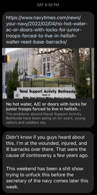 On Sunday Chaps followed up with the person who initially messaged us & asked what's been happening since the Navy Times investigation came out. It seems to be another dog & pony show. You can tell how frustrated the person is because they're not even asking for the bare minimum but, knowing how this usually goes, they still can't bring themselves to have faith things will change. A lower-enlisted tale as old as time.