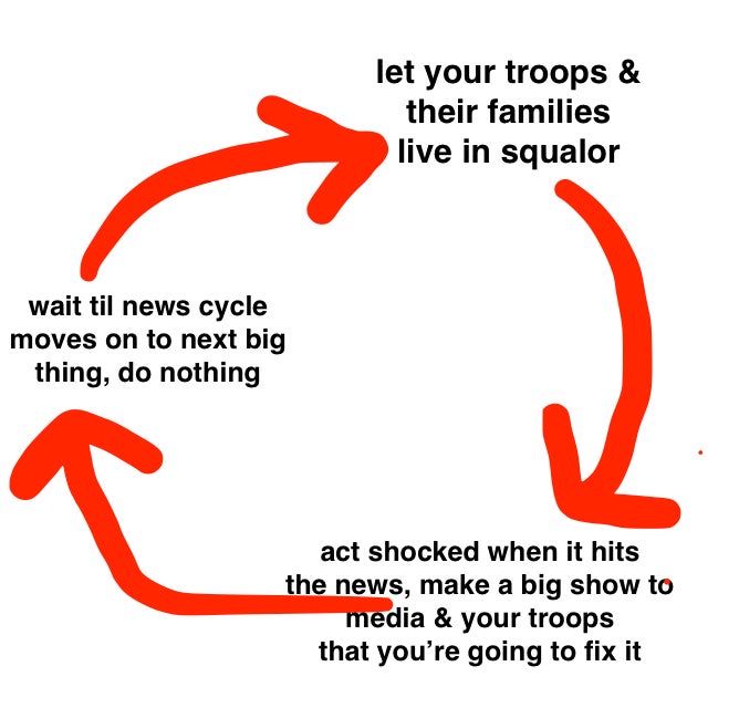Worth noting, there is good military housing out there (if you rank high enough, heh heh), but there is still faaaaar too much that is unacceptable. When we went to visit the Air Force Academy I was legit taken aback by how old and decrepit their rooms were. Some of the furniture was so old it was falling apart. If you are serving this country you should not live in an asbestos filled barracks (like I once did, woot woot), or have to worry about your children being poisoned while you're off training, or get off a long day of work and feel absolute dread on your way 'home' because your morale is crushed by depressing conditions. For the life of me I do not understand why this continues to happen when we have the money for 20 year quagmire war goofin' & F-35s.
