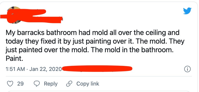 "Well when I was in our barracks was only a dirt floor covered in fire ants holding tiny knives and not only did we not have AC, we didn't have windows, and it was on fire and we didn't mind 'cause we weren't pussies and ya'll crying about some little itty bitty mold spores is why we lost Afghanistan and…"