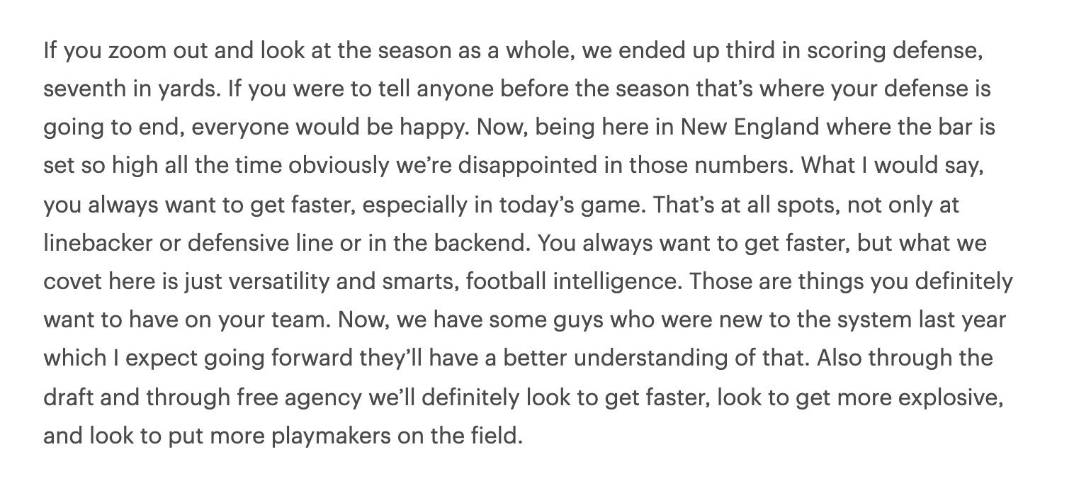 Also, that the people making the decisions are under no delusions of what they need to do to get back on top. To hear Mayo tell it, they're not panicking. They understand they have a good defense. But good is never good enough here. The standards remain as high as ever. They need to get faster. But only when it's speed mixed with versatility and football intelligence. They need to get faster and more explosive, but with true playmakers only. They're not going to stop Josh Allen with a bunch of trackletes. It's going to just be about 40-times at the Combine like Al Davis is walking the field with a stopwatch around the collar of his nylon tracksuit.