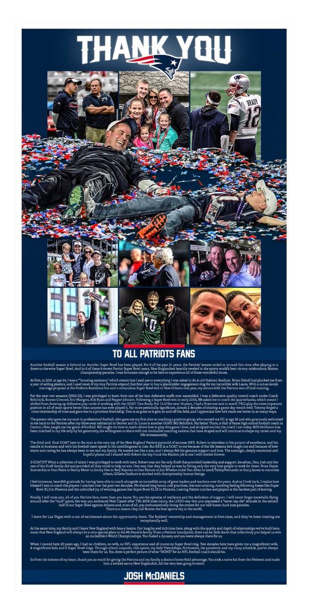 “Our lengthy and rich time here, along with the quality and depth of relationships we’ve built here, mean that New England will always be a very special place to the McDaniels family,” he wrote. “From a Patriots’ standpoint, there can be little doubt that collectively you helped us win an incredible 6 World Championships. You fueled a dynasty and you were always there for us. ...