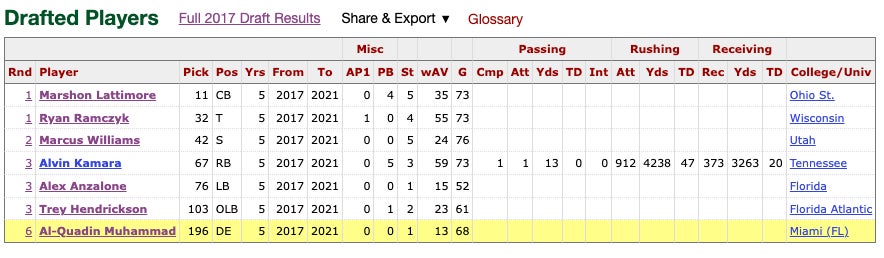 The point of the Draft, in my estimation at least, should be to leave it with as many good football players as possible. This all seems novel but it really isn't, folks fuck up their drafts and get fired every single year. The 2017 New Orleans Saints draft class should be the standard, non-quarterback centric draft you should be aiming for.