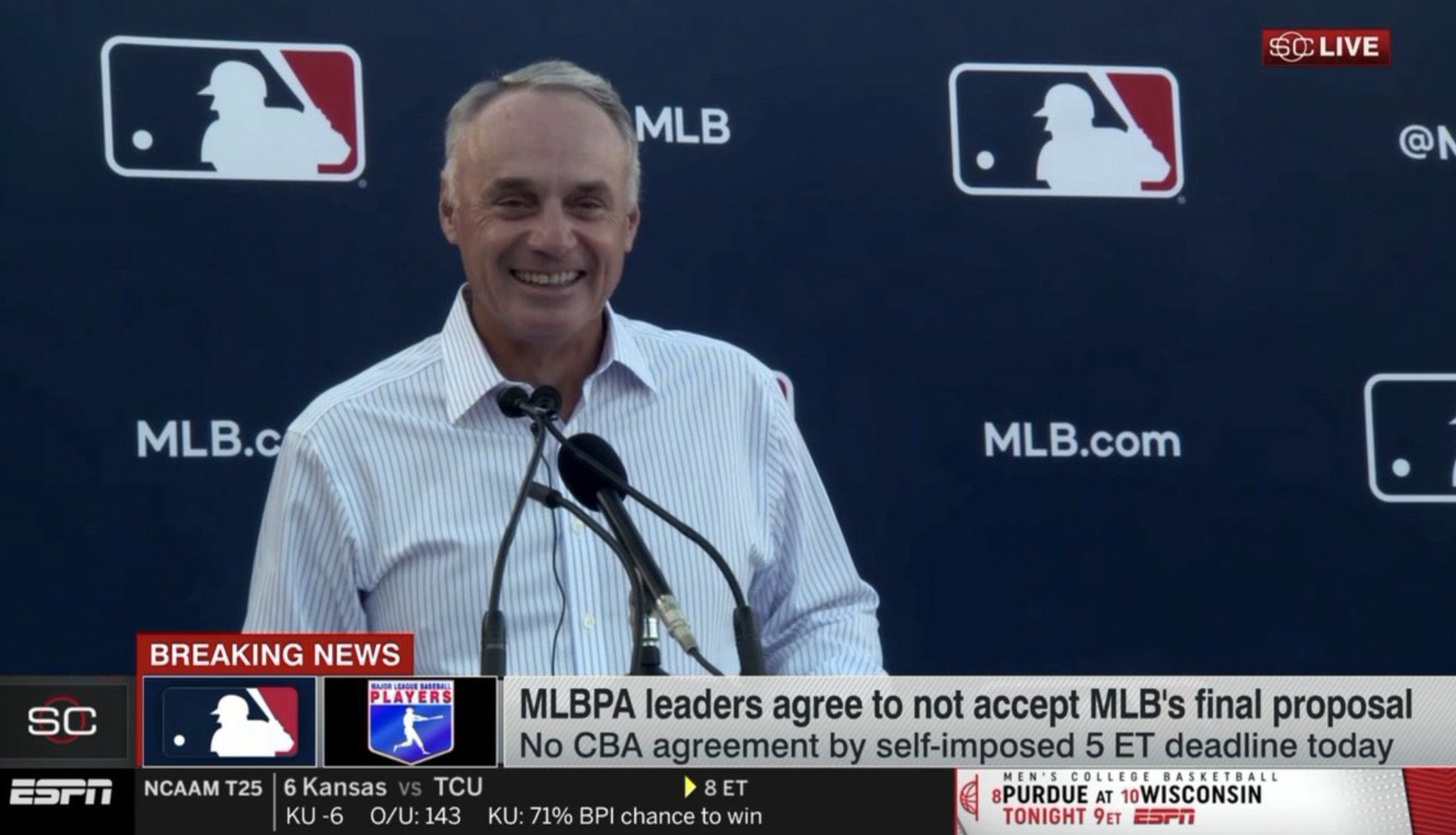 I'm not sure who told the commissioner of baseball to smile and laugh as he announced the cancellation of regular season games for his sport, but it couldn't have been more fitting for the sniveling rat that Rob Manfred embodies. Before giving his statement he actually got up there and laughed. Just laughing right in our faces during one of the darker moments for the sport in recent time. Fuck us, man.
