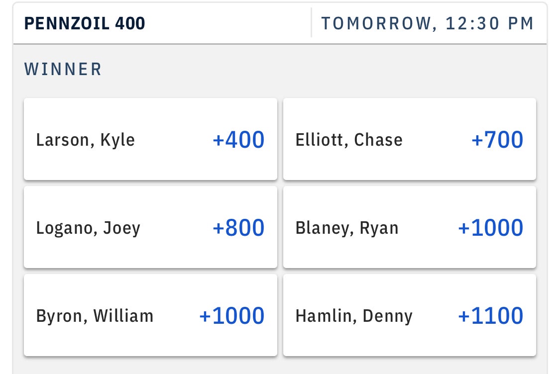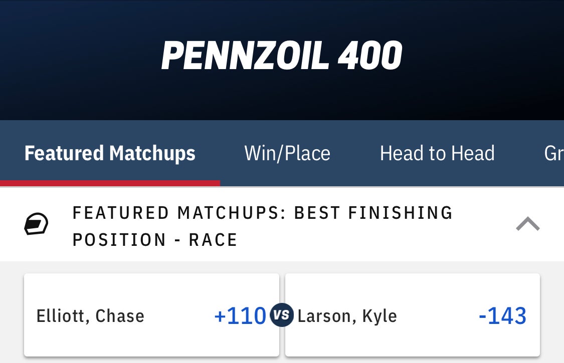 As a result, both drivers have the shortest odds to win with Larson at +400 and Chase +700 currently on the Barstool Sportsbook.