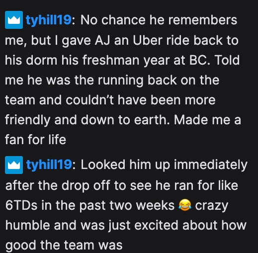 AJ is one of the most down to earth, humble athletes that I've interacted with. One of our Twitch viewers, TyHill19, ubered AJ home one night when he was a freshman at BC and had the exact same perspective of AJ.
