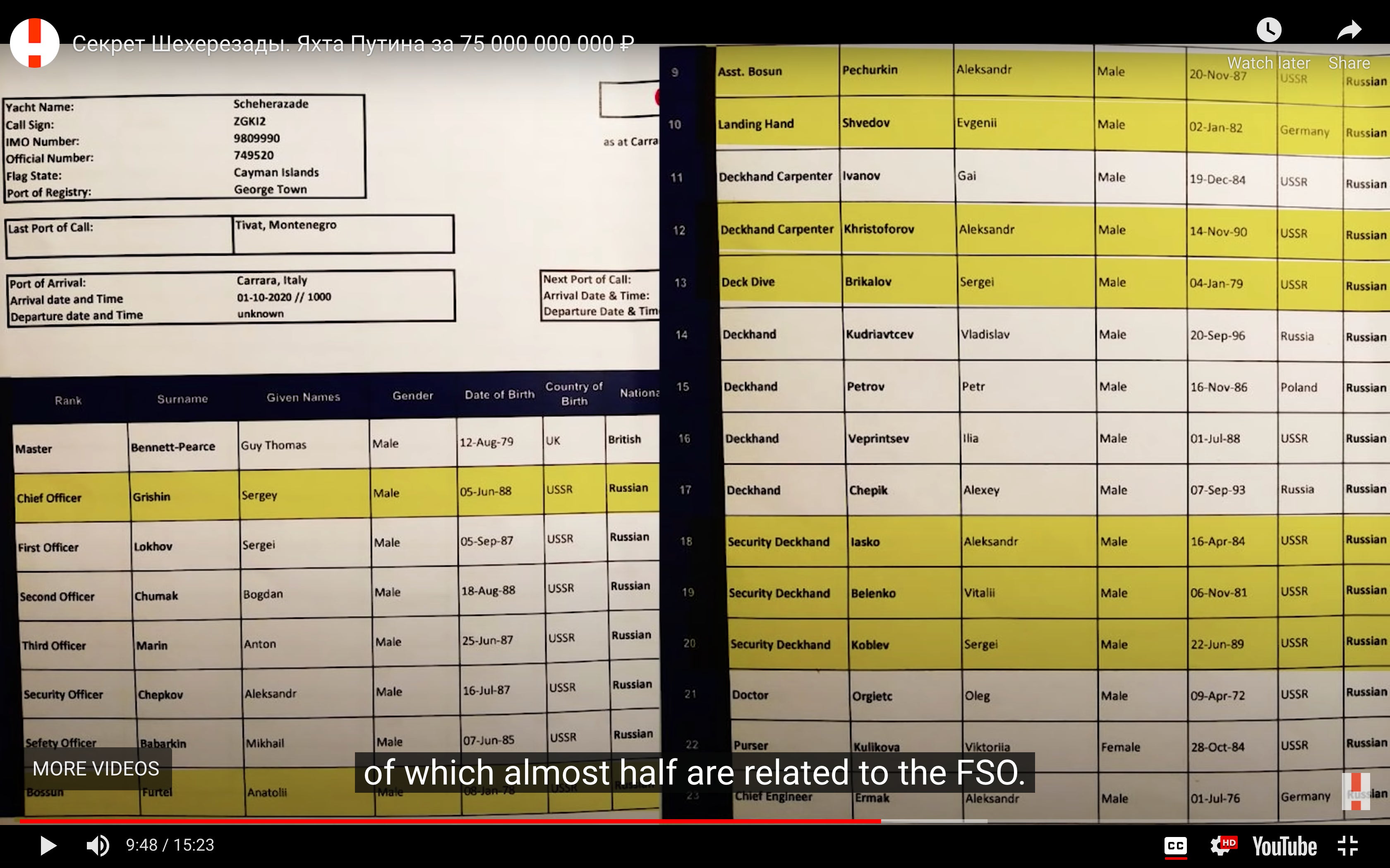 The group obtained the manifest, or all-Russian crew list for the yacht, and found that almost all of them were employed by Putin’s security detail, the Federal Protective Service, known by its Russian acronym FSO.
