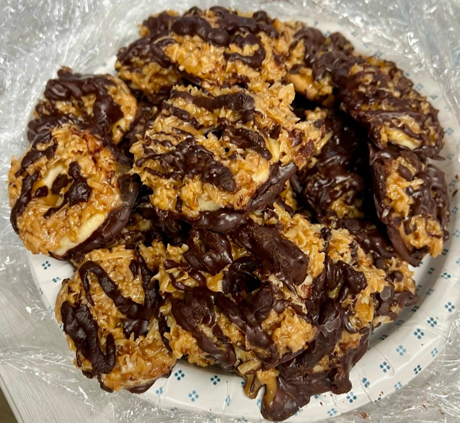 Wednesday, I made mouth-watering homemade Samoa cookies for the office. Four hours of labor for these bad boys! Nothing compared to a child, but these don't talk back.