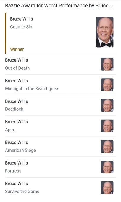 Finally, this diagnosis might explain a lot. Willis appeared in no less than eight terrible, low budget movies last year. So many that the last weekend's Razzie Awards created a special, one time only category of Worst Performance by Bruce Willis in a 2021 Bruce Willis Movie: