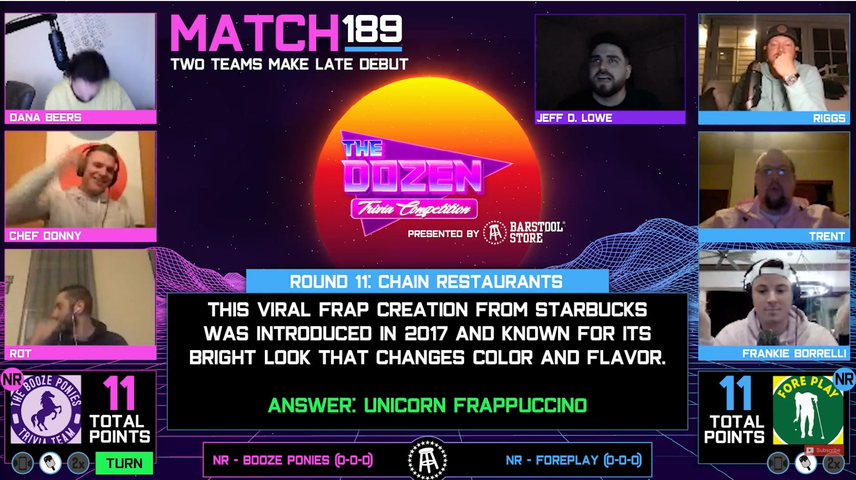 From there Foreplay missed their 11th round question, and both teams got geography so we went to OT. Like Dana said, the Booze Ponies don't play for one point. He was right, because the Booze Ponies dominated the OT question and brought home their first win. I'm happy that I was able to assist in the win, Dana and Donnie were great and they're going to do very well with Will. They're an exciting team for sure. Foreplay is going to be a menace. They're smart, they know they're smart. They have all the categories covered, be on the lookout for them to make a run, I guarantee it. I loved helping Booze Ponies get their first win, but I also understand they have another teammate, he understands next man up better than anyone. I wish them good luck moving forward.