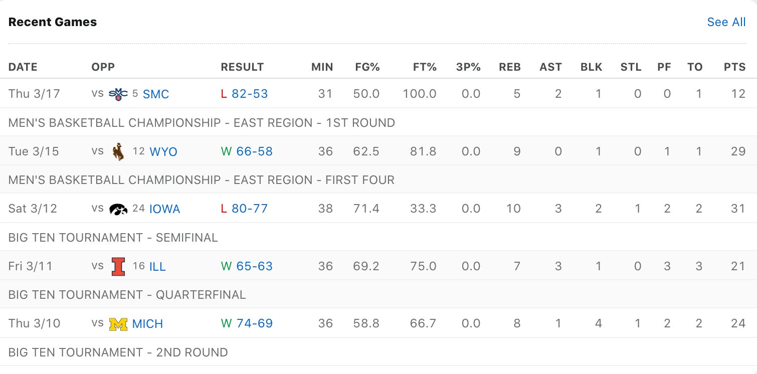 TJD kept the team together when Archie left, and has yet to reach his potential without great guard play, but STILL found a way to FEAST in the Big 10 / NCAA tourney before the team ran out of gas against St. Mary's.