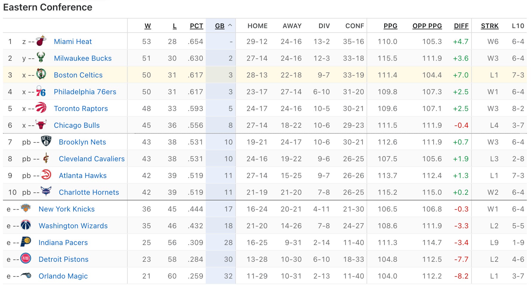 The only seeds that are locked in heading into today's action are the Heat at #1, the Raptors at #5 and the Bulls at #6. That means seeds 2, 3, 4, 7, 8, 9, 10 are up for grabs which seems pretty important. The interesting twist to the race in the East is we're going to know a pretty big domino before the 7pm games start. The Bucks (resting everyone) are playing the Cavs at 3:30pm. The Cavs desperately want to win that game so they can put themselves in a position to potentially host the play in at the 7 seed. It also would prevent them from dropping potentially dropping into the 9/10 side of the bracket where one bad shooting game can end your season.
