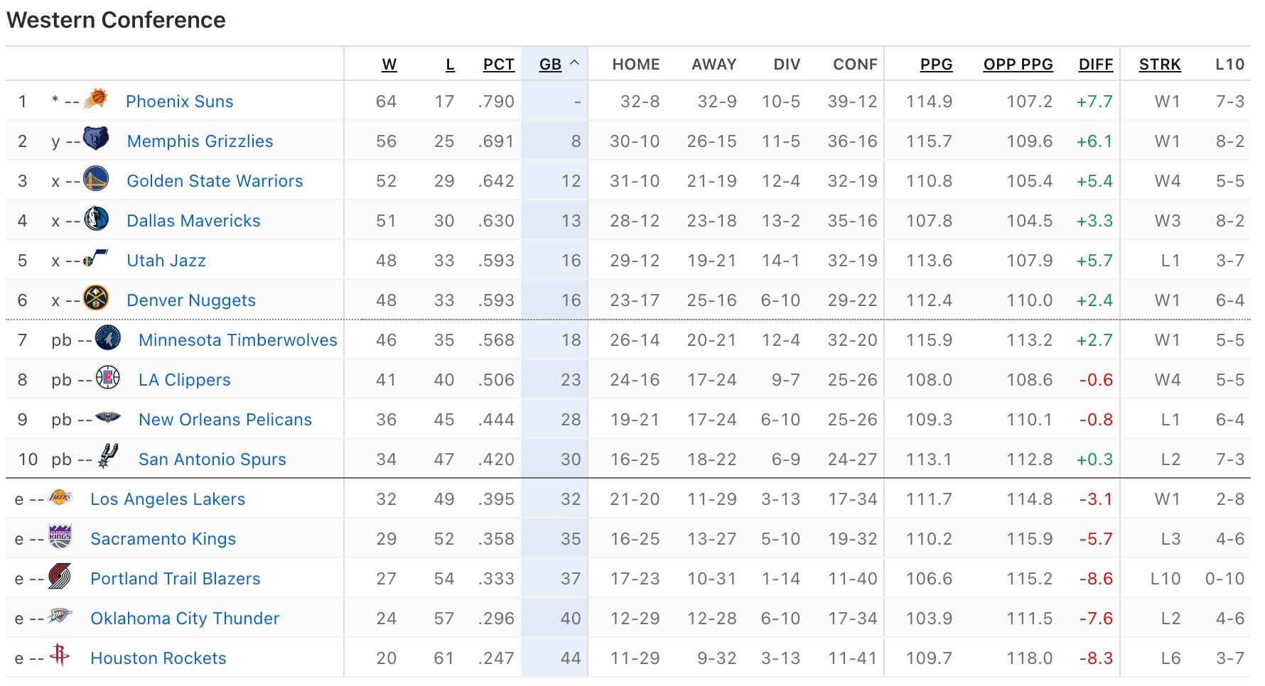 Admittedly, not as much drama and chaos on this side. Things are mostly locked up at the top and the bottom which means the intrigue comes from the middle. I think it's pretty obvious what every one of the 3-6 teams are thinking heading into the playoffs. How can you avoid the Suns for as long as possible? There's no shame in wanting to position yourself to the side of the bracket where you might not have to worry about that wagon of a team until a potential WCF. They lost 17 times all goddamn year.