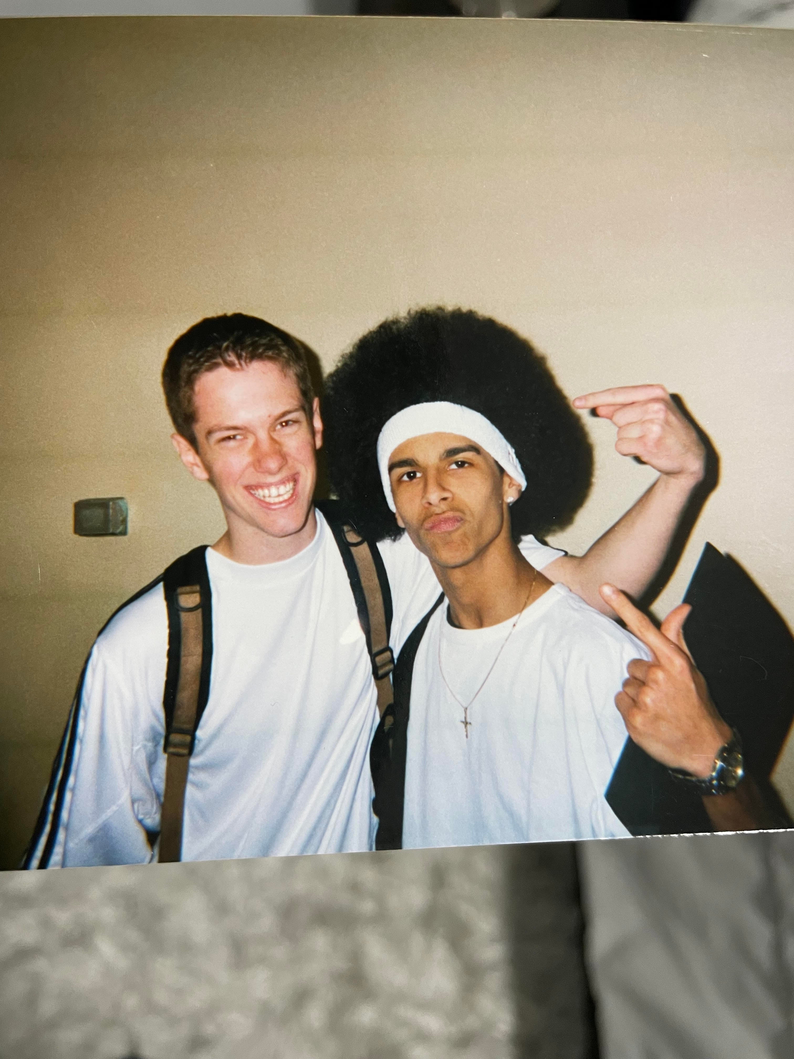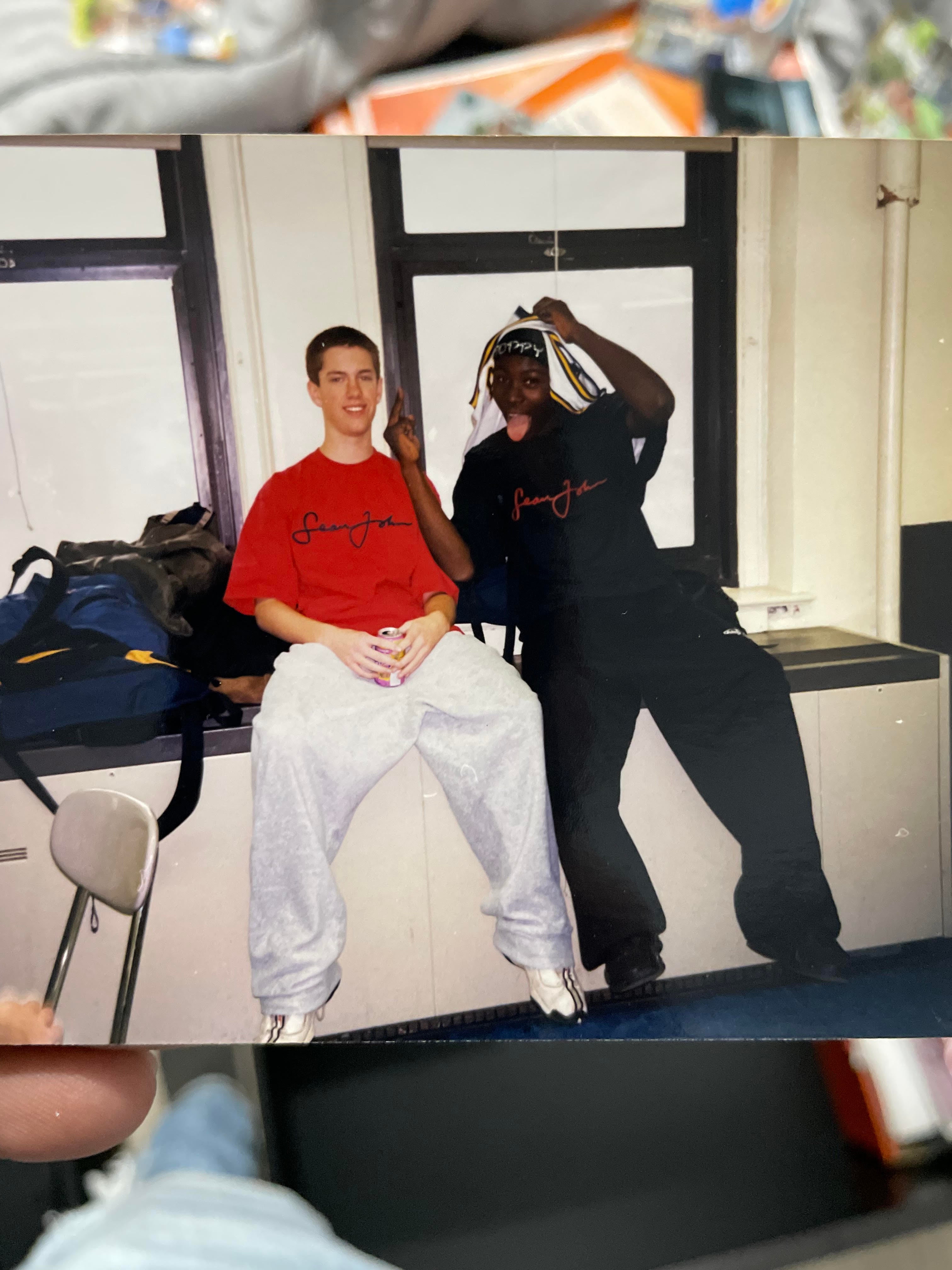 wearing the preeminent Sean John shirt - the one with the rubber script across the chest - with a pair of XXXXXL grey sweats on that I must have borrowed from the Big Dick Meme Guy, Jumpman Pro Quicks on the feet, trying to teach my teammate…"Poppy"…how to run our most basic basketball plays. His name was Dennis, I think he was Hatian, he called himself Poppy, and he let us know by wearing a rhinestone headband that spelled out his name. He and I…were wearing the same clothes. You understand how absurd that makes me feel? It makes me feel patently ridiculous. The only other feeling I get from looking at the picture? The feeling of satisfaction remembering how I cracked my back on that classroom seat in the bottom left. Perfect height, perfect sturdiness, arched my whole shit on that backrest and felt my spine go off like a strip of firecrackers CLICKITY CLICK CLACK POW!