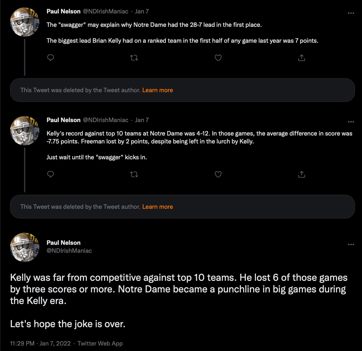 Regardless of whether the account was Kelly or not, it seems evident he isn't convinced Freeman will do the best job in the world taking over for him at Notre Dame. I guess time will tell which side comes out of this divorce looking better.