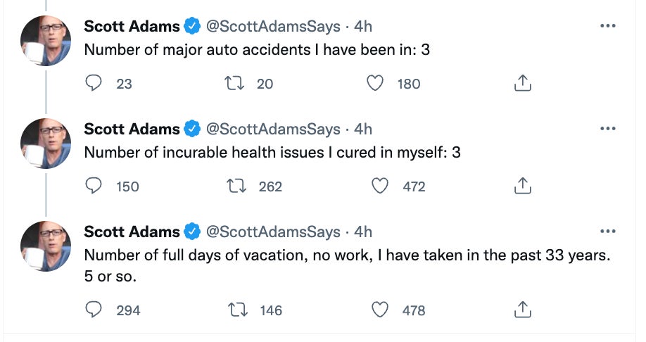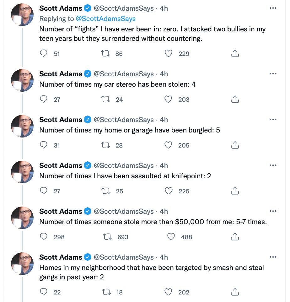 But anyway I guess Scott Adams made a bazillion dollars off of Dilbert and is now a crazy person. But not for nothing, yesterday's Twitter rant is why Twitter is the best. I hadn't heard the name Dilbert in at least a decade, and now Scott Adams will live in my head rent free for the rest of time. Nevermind the above tweet, casually saying he's had a gun pointed at his head 5 times, he also sent out the following tweets: