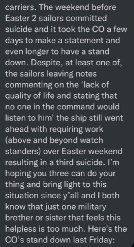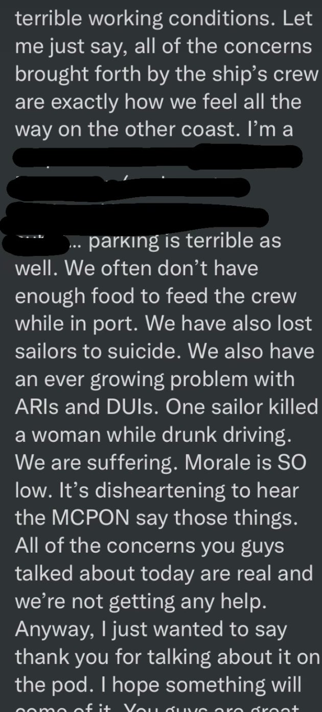 In closing, as I was finishing this blog the ZBT crew & I were texting each other about the DMs we've received following this episode. We heard from others on the USS GW saying it's even worse than the news stories have shared, and from others across the Navy like this person sharing that's not just that particular ship… I do not accept that nothing can be done for these troops & the public should be angry about this on their behalf, too: