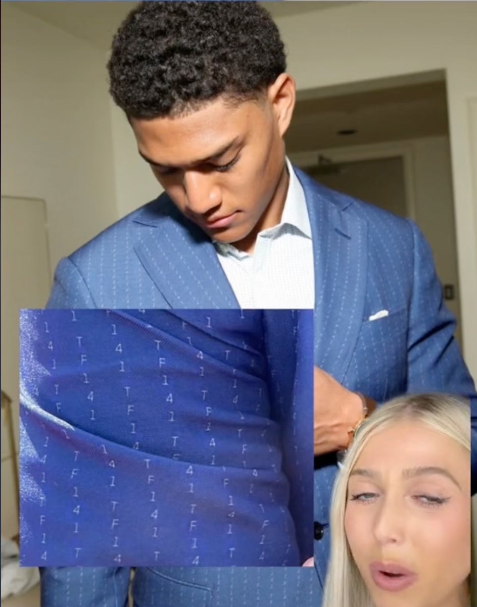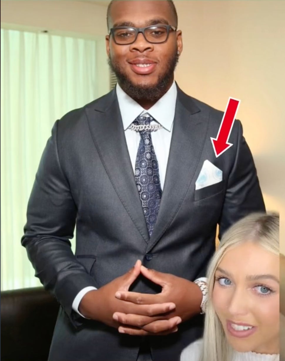 Lastly, Kyle Hamilton wore a suit that at first looked like normal pinstripes, but at a closer glance, you can see these are actually Task Force 141 letters: