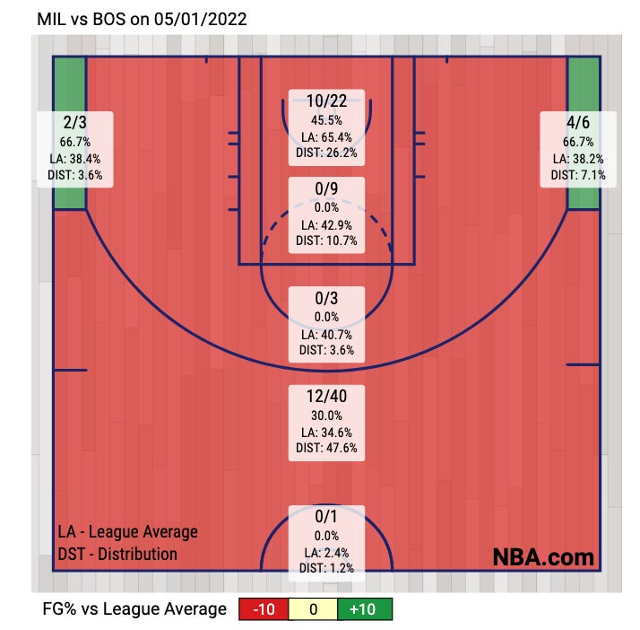 just 10/22 at the rim and 0/9 in the paint. Woof. A combined 10/31 in that zone is about as bad as you can get and what we learned is there is a rather gigantic difference in the Bucks rim protection than what this team went through with BKN. Lopez for whatever reason never fouls, Giannis is the most devastating weakside defender in the league, even Bobby Portis held his own. You could tell the Celts didn't even want to fuck with the paint as this game went along and that's not a great sign for a team that is what I would call….streaky when it comes to shooting the basketball. Tatum and Brown were a combined 3/11 in that zone. You're not winning with that.