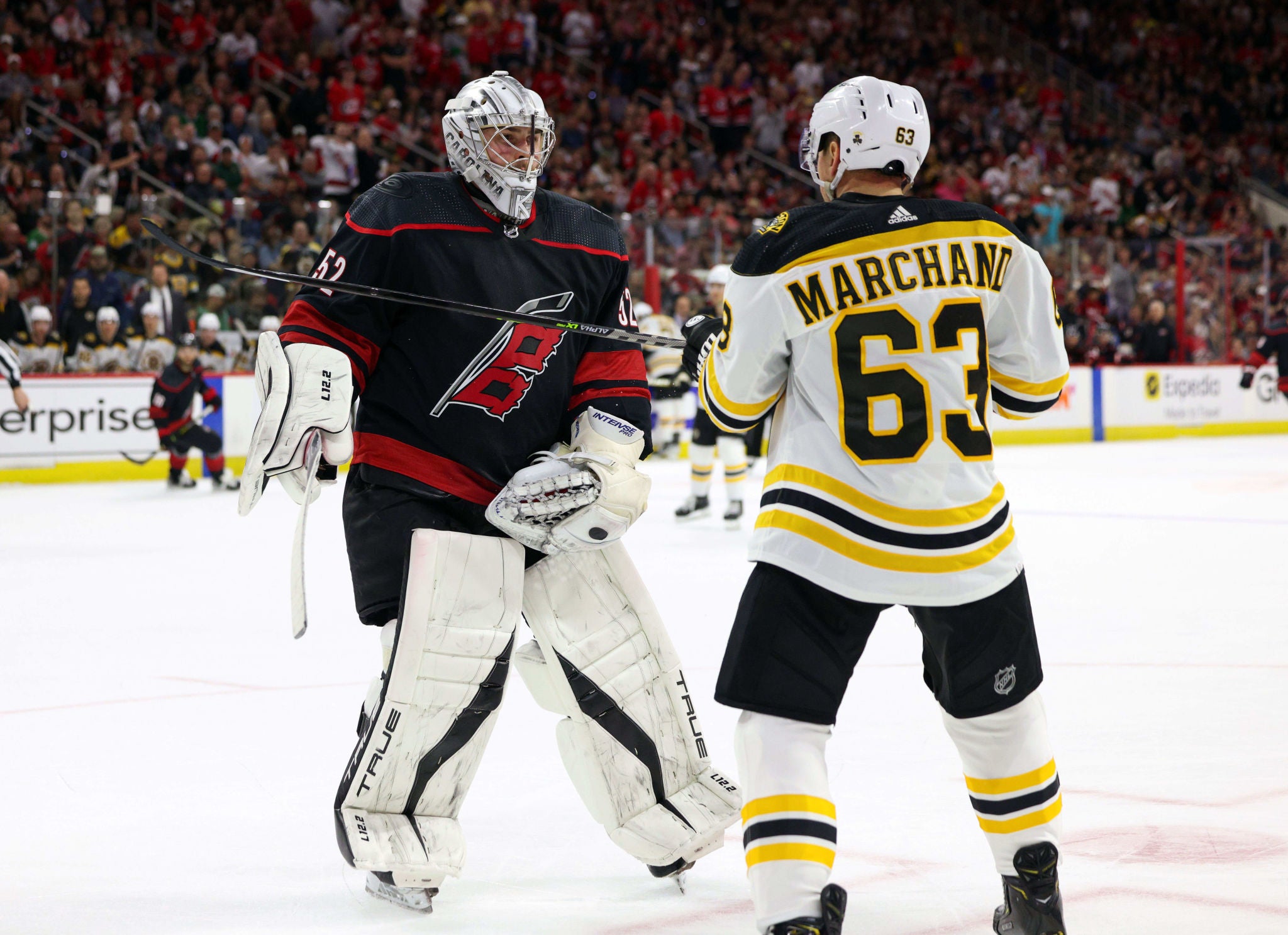 First up we'll start with the Boston Bruins who are just gooning it up at this point since there's no shot they can keep up with Carolina any other way. The team can't score so they figured their best course of action would be to take out Antti Raanta, which is exactly what David Pastrnak did here.