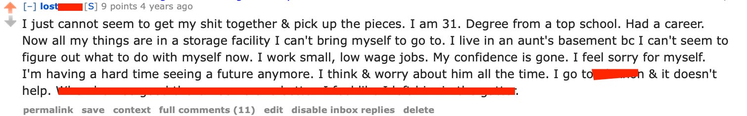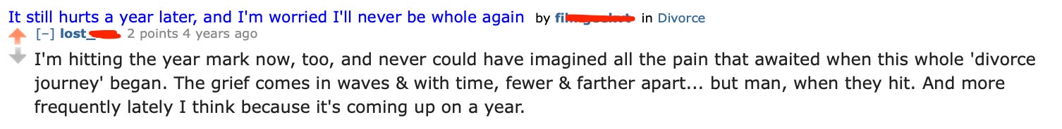 Friends & family kept telling me the only healer for heartbreak is time, and turns out that is the truth, but the bummer is that in the moment nothing can convince you of that… So there you are at 1am sipping cheap rum, scrolling around on r/Divorce practically begging internet strangers to feed you a magical, personal nugget of wisdom that will give you an 'aha!' moment to get you through it… An anecdote or quote or factoid that will act as a salve for another night of ~agony~. (Yes, I am rolling my eyes at myself as I type this & re-live it.) I'd find other people who appeared to be hurting as much as me & offer them nothing but "same here, oh my God it's terrible". Very helpful!