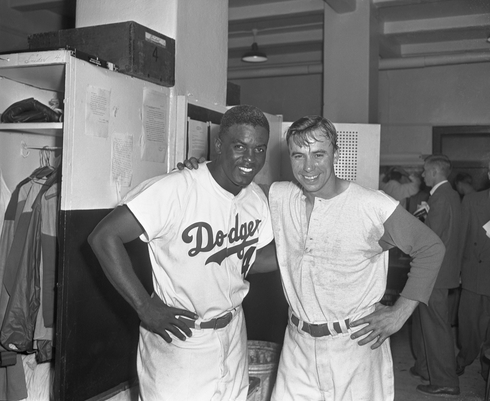 In a seminal moment of the 1947 season, Pee Wee Reese embraces his Brooklyn Dodgers teammate Jackie Robinson before a game against the Cincinnati Reds at Crosley Field. Reese, a native of Kentucky, had friends and family on hand and wanted to send a message to fans who were hurling racial epithets at Robinson. It was a symbol that Jackie was being accepted by his team.