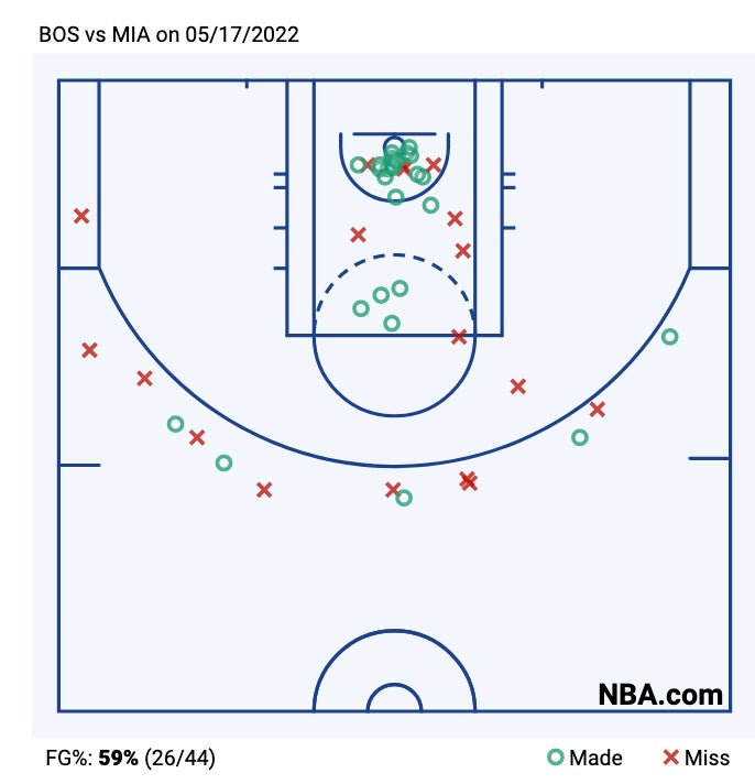 This was not a case of the Celts relying on threes either, like we saw them do against MIL. They attacked. Of those 62 points, 42 came in the paint which was the most first half paint points the Celts have had in 25 years. Their shot profile was about as close to perfect as you could want