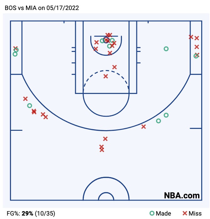 - Alright, let's just get this over with. What the fuck was that third quarter. I'll tell you what it was. It was the worst quarter the Celtics have played in any game (regular season or postseason) in 4 years. To lose a quarter by 25 points is so insane it still doesn't seem real. They shot 2-15, they had 8 TOs, and I couldn't help but notice it was very similar to another ECF game against this Heat team. Does this look familiar to you?