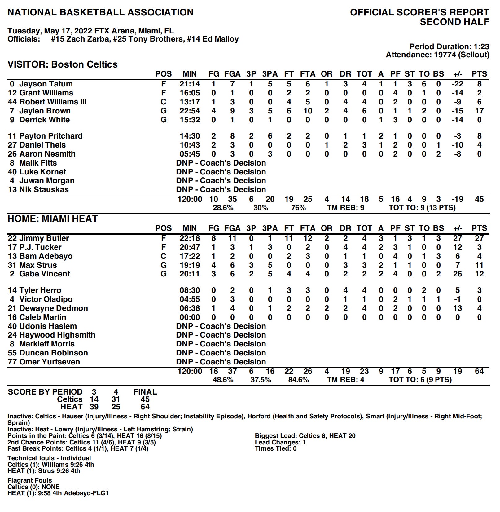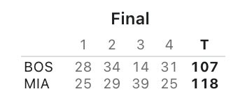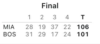 - Speaking of self inflicted wounds, you could say missing 8 FTs sort of sealed their fate. Is it fatigue? What the fuck is going on from the line recently. Every game we're seeing the Celts, who essentially all season were the best FT shooting team in the NBA, miss 5, 6, 7 FTs in a game. Jaylen missed 4 by himself. He and Tatum combined to miss 6 of the 8. I don't think I have to tell you how inexcusable that is. Leaving that many points on the board is asking to get beat. The fouls/FTA were even for both sides, so it's not like the Celts weren't getting their own share of calls. The difference was MIA went 30-34 and you went 24-32.