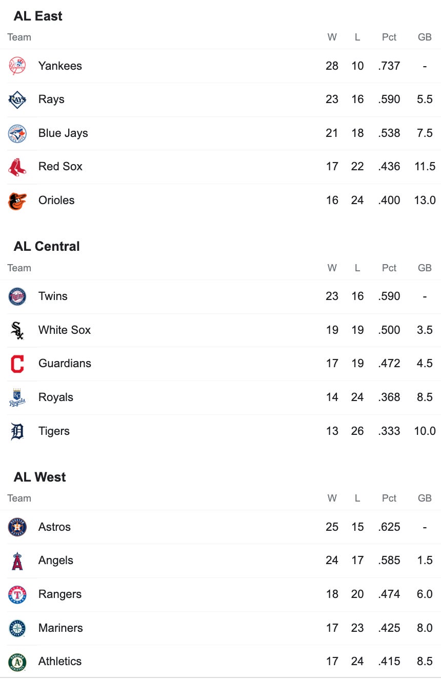 I put the Rangers 27th in my power rankings and turns out they just won't lose. Even if I hate the lineup and think Semien is a bum and that they're in purgatory this season. Even if I think they've got trash leadership and a brutal division. Nothing I say can bring me back from the shame Rangers fans are pouring on me. Whatever. Keep it coming. You guys have a lot of emotional shit to work through and I'm happy to be your punching bag. Speaking of which.