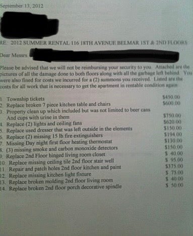 It's a funny story , and you'll all likely laugh about it. But in the end it's never worth it. First off , the landlords jack up prices of repairs (more on that later), and it's pretty shitty to make everyone lose their security deposit, or expect them to pay repairs when they didn't partake in the damage, even worse if they weren't there at the time.