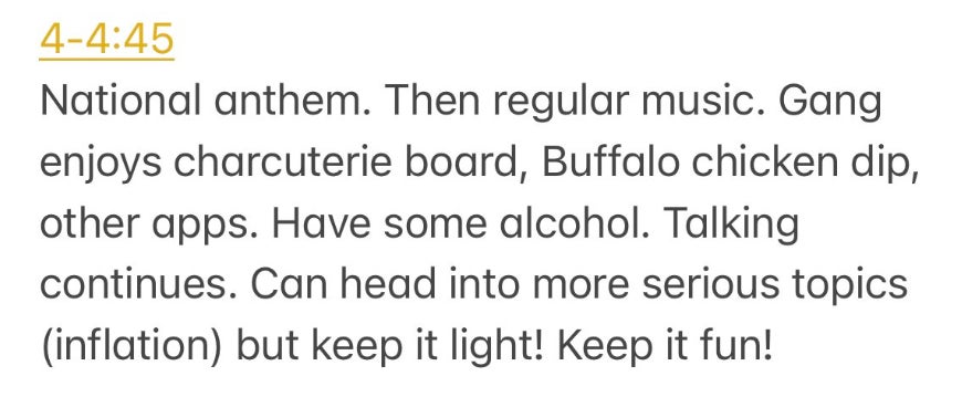 It was Memorial Day, so I felt it was important to start with the national anthem. Out of respect. Then I turned on my "ultimate" Spotify playlist which was carefully curated through an algorithm to produce maximum enjoyment for each person's individual interests and personalities. As we chowed down on some apps, it was now acceptable to delve into more serious topics if it felt right. Inflation, abortion, gun control, etc. But the most important thing was to keep things LIGHT and keep things FUN!