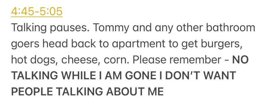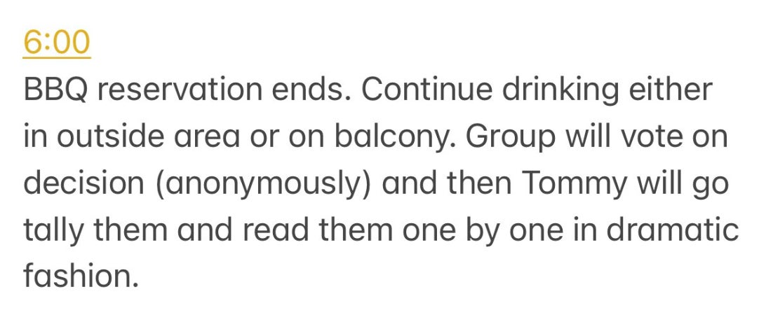 Summer is here and it's officially BBQ season. As a self-proclaimed GrillMaster with communal BBQs in his apartment complex, I decided to have some friends over yesterday for a Memorial Day BBQ. While it seems like a fun, relaxed day on the surface, that was not the case. I have crippling anxiety when it comes to hosting gatherings and am always afraid people will leave thinking "God I fucking hate Tommy and I'm never gonna speak to him again. I hope he fucking dies right now." And I couldn't let that happen. So I decided to lay out a full itinerary for the day to ensure maximum fun for everyone.