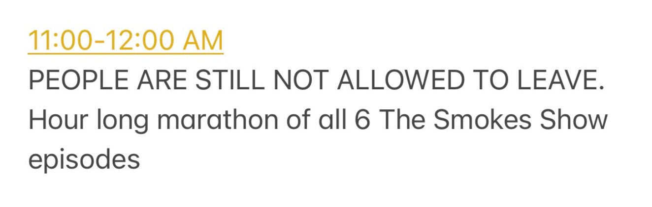 People were still NOT ALLOWED TO LEAVE. In my experience from hosting parties, when people think they have the option and "free will" to leave, it makes things a lot less fun. They’re often distracted, wondering “what’s happening outside this party?” or "what time should we leave?" Making it clear that they CANNOT leave under ANY circumstances just helps keep everyone focused and ease tensions. You always want a relaxed party. And what better way to relax and have fun than with a marathon of The Smokes Show?!?!