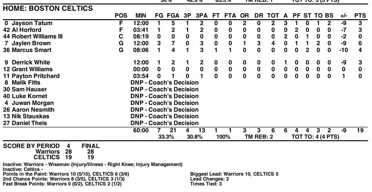 - Through 4 games, I'd say we had 2 really good Marcus Smart performance and 2 fairly shitty ones. It's no surprise that they won the two good ones and have now lost both of the bad ones. Unlike Game 3 it wasn't as if Marcus had a turnover problem (just 2), but outside of early in the 3rd quarter where he dug the Celts out of an early hole, I just don't think he played all that well. I know the line says 18/4/5, but it didn't really feel impactful. He was a -17 which was only outdone by White's -19, and even though his individual defense wasn't bad, he held Curry to just 4 points on 1-4 shooting on 25 possessions, all I can say was it didn't feel like Smart played that well.