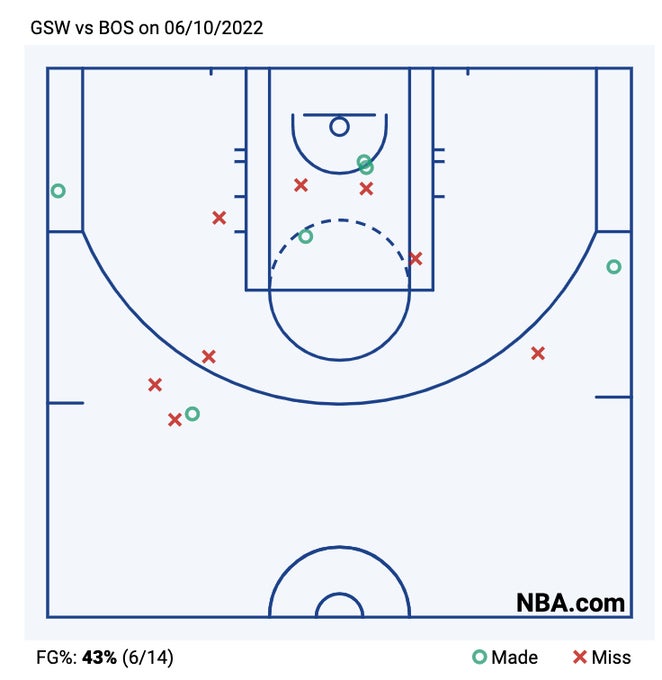 They finished just 19-47 (40%) on all 2pt FGA. They were just 9-22 in the paint and 3-14 in the midrange. It's just tough to beat the Warriors if you are going to be so poor inside the arc and in the paint. Tatum is shooting just 25% in this series from the paint and just 11.8% from the midrange. That's devastating. Derrick White is shooting 23% in the paint. Those are two pretty important players when it comes to paint touches, and the scoring production simply hasn't been there.