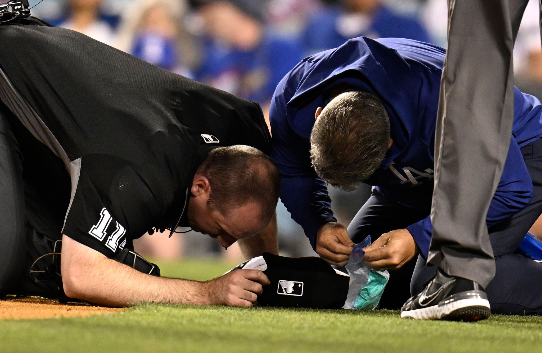 Hell of a game last night in Los Angeles but we did have a terrifying moment late in the ball game. Mike Trout's bat broke on a bloop single in the 9th and actually went through the umpire Nate Tomlinson's mask and got him right in the face. Tomlinson dropped to his knees instantly, not only did it hit him in the face, it was the sharp, broken piece of the bat that got him. We've seen catchers get hit on a backswing occasionally but this is a whole other story. The fact that it went right inbetween the bars of the umps mask, a scary situation for sure. Trout made his way down to first but you could tell he was concerned.