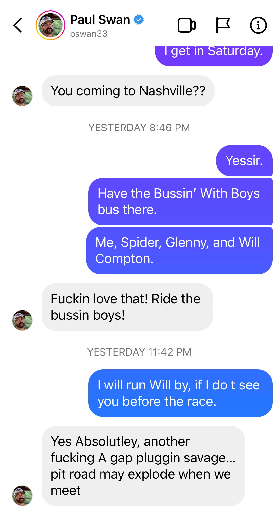 And I agree with Swan's explosive prediction… So I will open up my thesaurus and tell y'all that I am about to hop on a plane to meet up with an imposing posse in a fantastic city for a resplendent weekend capped off with a phenomenal race at an extraordinary 1.33-mile concrete oval in Lebanon, TN.