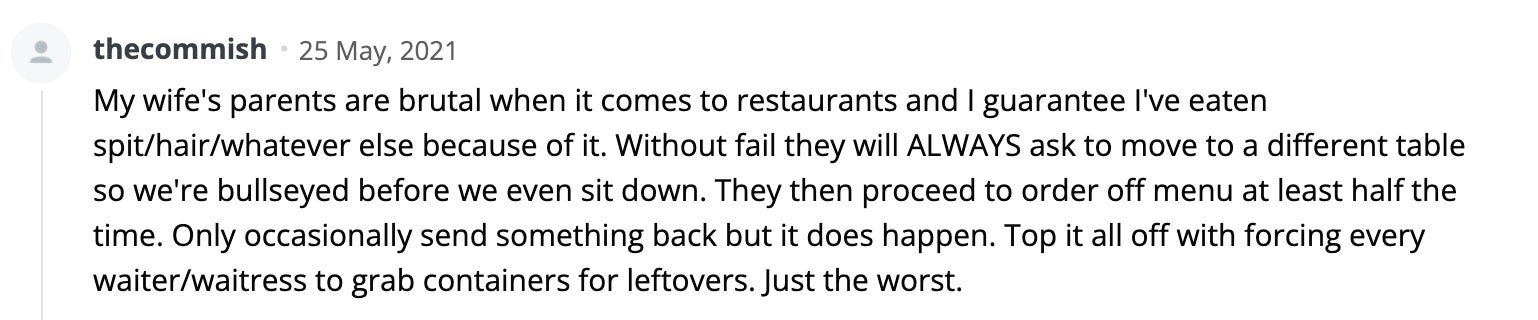TLDR; "We should probably feel guilty, but [he] broke the cardinal rule. Don't FUCK with people who handle your food." - Monty, Waiting… (2005)